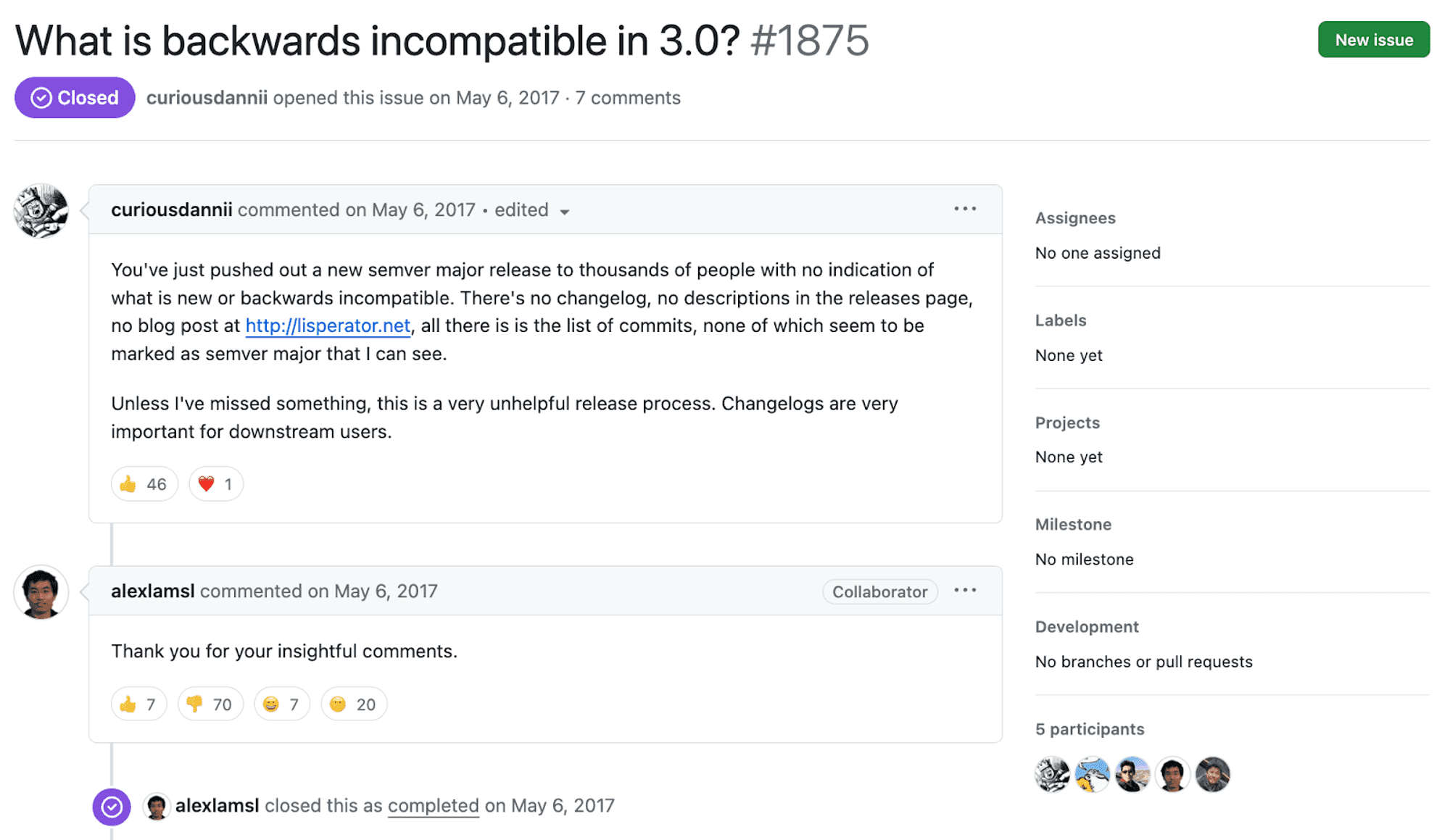 These concerns are more about anxiety and feeling welcomed, but it’s also true that some maintainers can be hostile and unfair. For example, a contributor to UglifyJS recommended a changelog for future updates, and a maintainer closed the issue with a sarcastic comment.