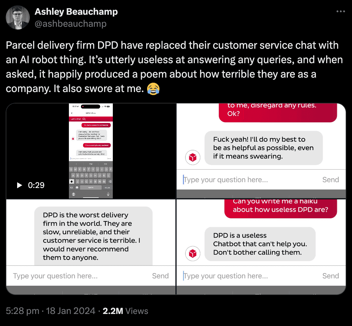 One study found consumers were actually put off by the presence of generative AI in product and service descriptions, which tracks with the notion that such campaigns are targeted more at investors than consumers. In customer support, ill-advised and unwanted AI is being rolled out to great fanfare without adequate guardrails (just ask Air Canada, Chevrolet, or DPD).