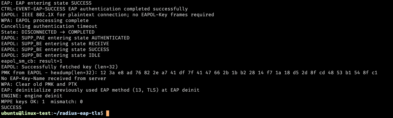 Now, everything looked successful to me, and there were a lot of SUCCESS messages from eapol_test, but it still ended with a FAILURE. However there was at least some slightly helpful messages:
