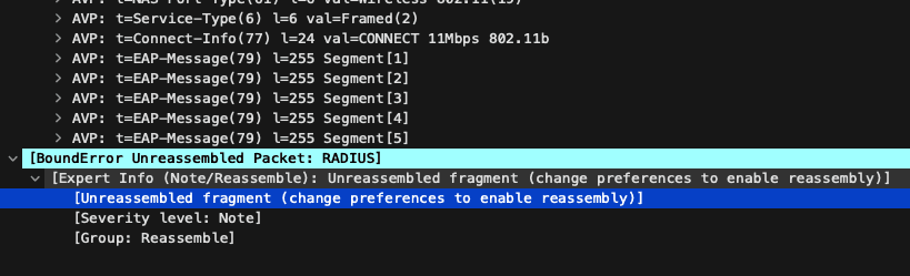 At this point I also noticed a very annoying issue that by now I'm pretty sure is a Wireshark bug; RADIUS packets with somewhat larger EAP payload would not be correctly parsed by Wireshark.
