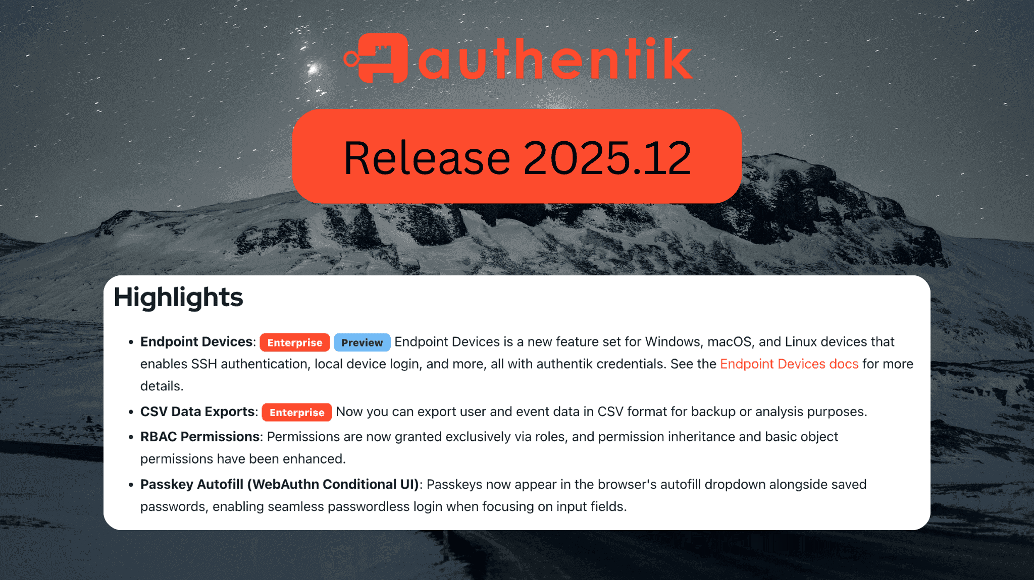 This release of authentik brings some big features, like managing endpoint devices, exporting data, and an overhaul of our permissions system.